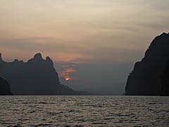 On the dam that created the reservoir/lake Tour bus that caught our attention Approaching 'The Raft' for a swim and a beer Thai visitors enjoying the lake Sun sets between the karsts on Cheow Lan Lake Sunset on Cheow Lan Lake (2005) Sunset on Cheow Lan Lake
